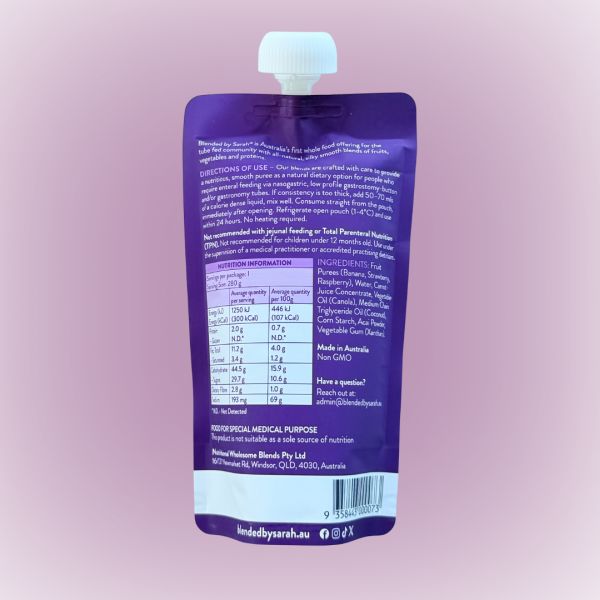 Berry Smoothie blend features a nourishing mix of Acai, Strawberries, Raspberries, Banana, Carrot and MCT. Each 280 g pouch delivers 300 kcal of whole food energy, providing a comforting and balanced meal option.