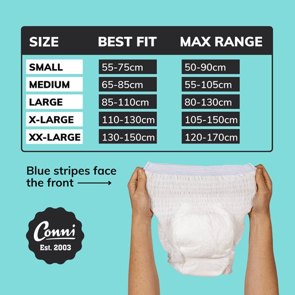 A Conni Pull-On holds two full voids/1,000mls. Please note that the capacity should serve as a guide. A range of factors can affect the working capacity and effectiveness of disposable absorbent pull-on underwear, resulting in a unique experience for each user.