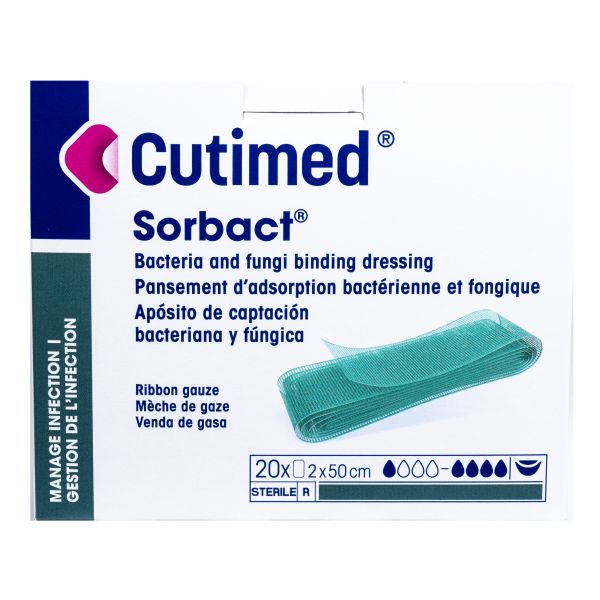 Indications: Cutimed Sorbact Ribbon Gauze is intended for use in the management of clean, contaminated, colonized or infected exuding wounds, such as surgical wounds, traumatic wounds, pressure ulcers, diabetic foot ulcers and leg ulcers. It can be used on superficial and deep wounds such as cavity wounds and fistulas. Cutimed Sorbact Ribbon Gauze is also intended to treat fungal infections in skin folds (intertrigo).