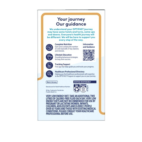 Very Low Energy Diet. Take an additional two litres of calorie-Free fluid each day. Unsuitable for use by Pregnant or Lactating Women, Infants, children, Adolescents or People Older than 65 years of age.