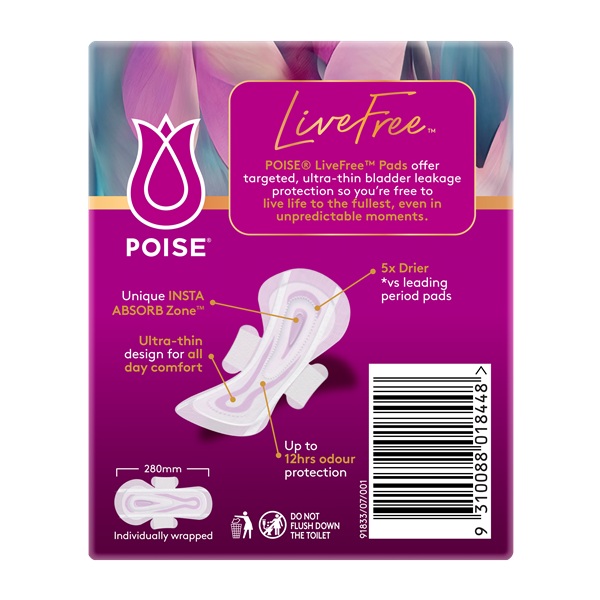 – Poise LiveFree Pads are 5 times drier than leading period pads, offering superior dryness and comfort.