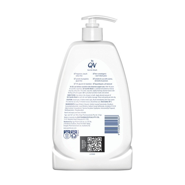 Gentle, soap-free cleanser for delicate skin. QV Gentle Wash is designed for dry and sensitive skin. It works to maintain hydration during cleansing so skin is left clean and soft. QV Gentle Wash is also non-comedogenic so it wont block pores. Benefits Recommended for cleansing drier skin as it contains a higher concentration of moisturiser than QV Wash. Maintains skins natural protective properties. Doesnt strip away natural oils like soap can. pH balanced, low-irritant formulation, free from colour, fragrance, propylene glycol, and lanolin. Suitable for use with conditions such as dermatitis, eczema and psoriasis. Suitable for sensitive skin. Click Here for more information