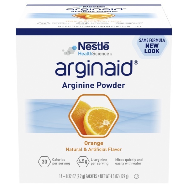 ARGINAID® is a fat free arginine powder designed for people with chronic wounds. Suitable for oral or tube feed use and provides 0.11 kcal/mL.
