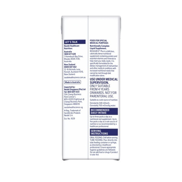 RESOURCEĀ® Plus is a food for special medical purposes specifically formulated for the dietary management of malnutrition and other medical conditions with increased nutritional needs that cannot be met through diet modification alone. Must be used under medical supervision.