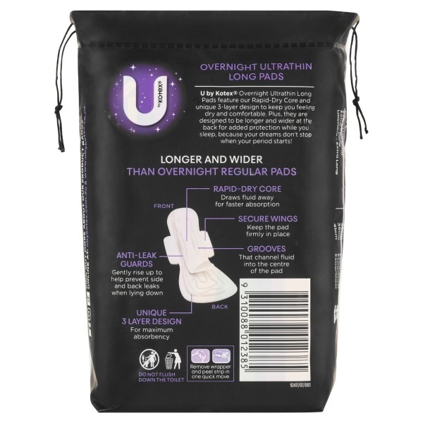 U by Kotex® Overnight Extra pads offer superior protection with their thicker build, Flow-Control ChannelTM, and super absorbent core. The 3D Back Leak Barrier TM technology keeps you dry, comfortable, and thoroughly protected.